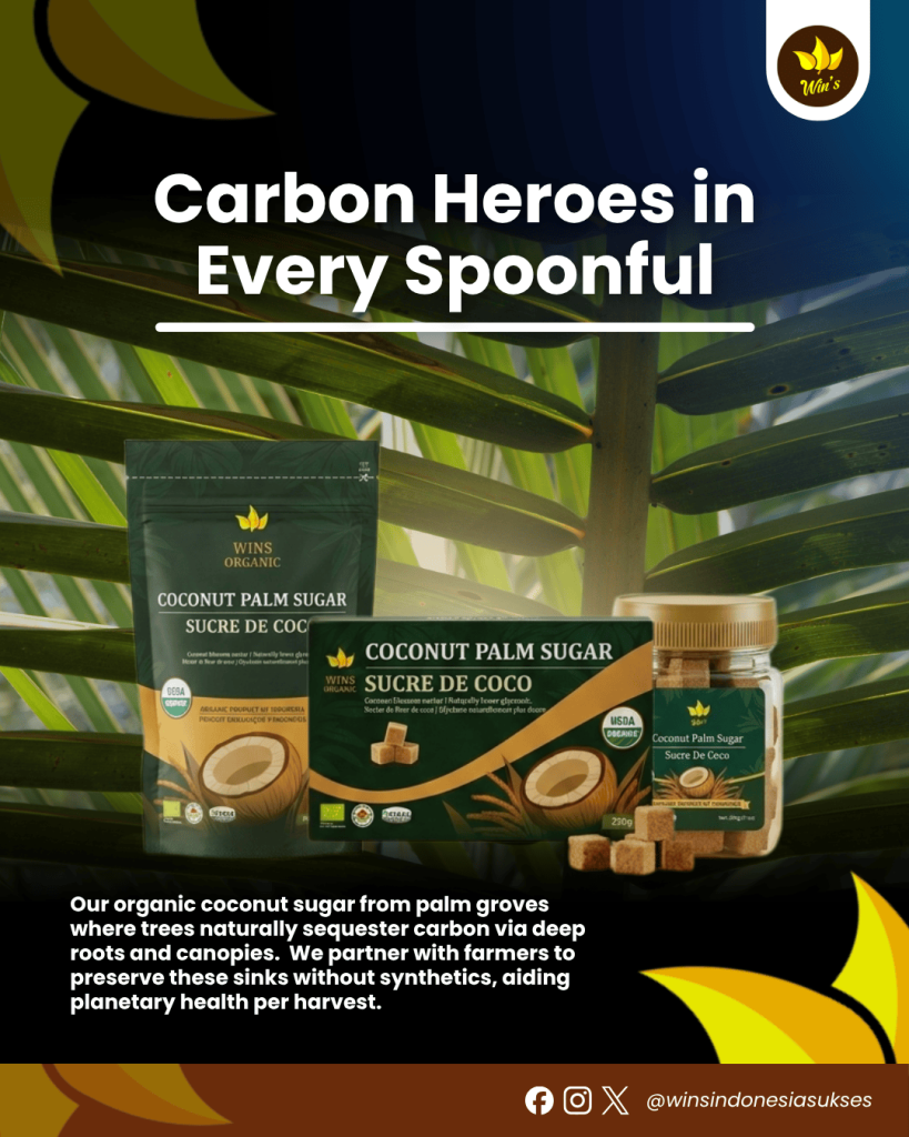 Our organic coconut sugar from palm groves where trees naturally sequester carbon via deep roots and canopies. We partner with farmers to preserve these sinks without synthetics, aiding planetary health per harvest.