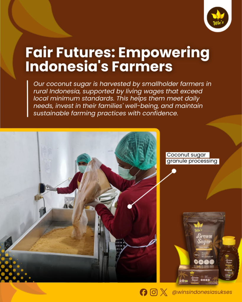 Our coconut sugar is harvested by smallholder farmers in rural Indonesia, supported by living wages that exceed local minimum standards. This helps them meet daily needs, invest in their families’ well-being, and maintain sustainable farming practices with confidence.