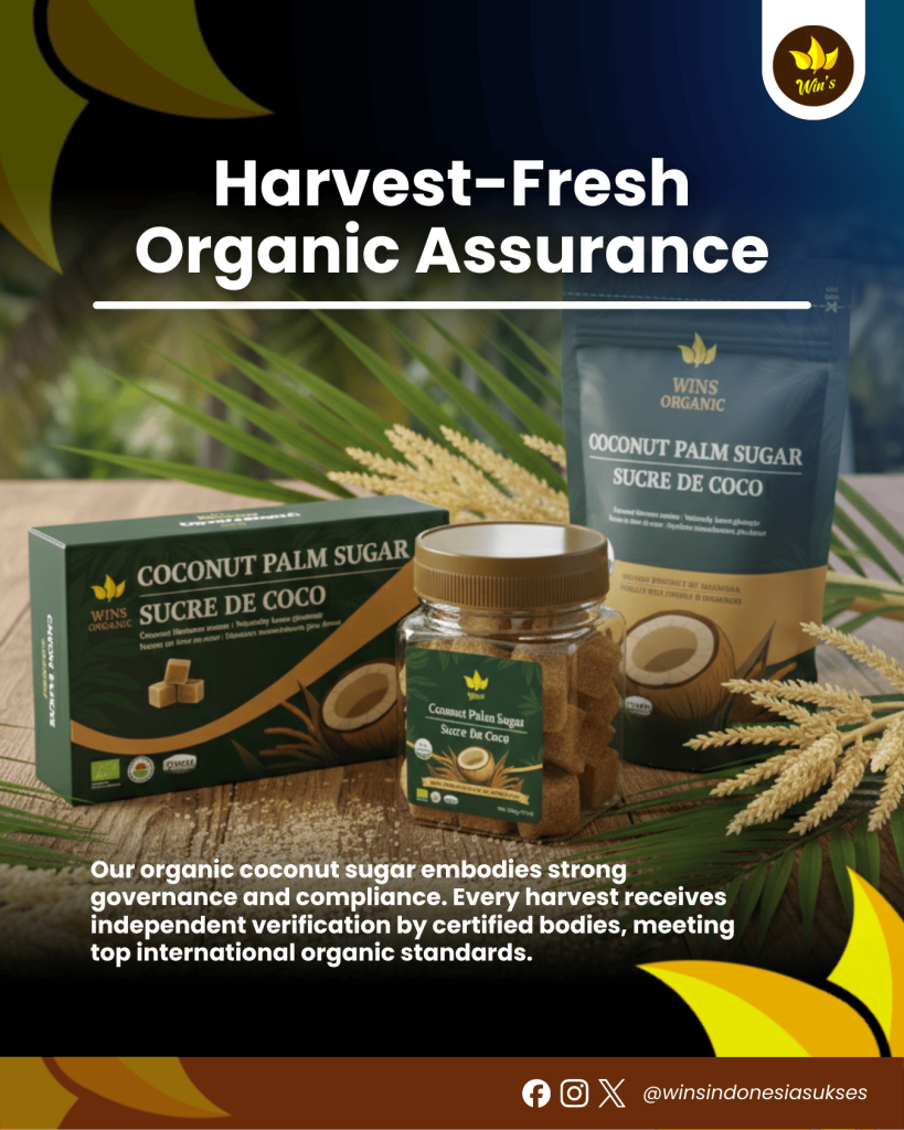 Our organic coconut sugar embodies strong governance and compliance. Every harvest receives independent verification by certified bodies, meeting top international organic standards. From sustainable coconut sap collection in lush groves to final crystals, this ensures trusted purity and quality.
