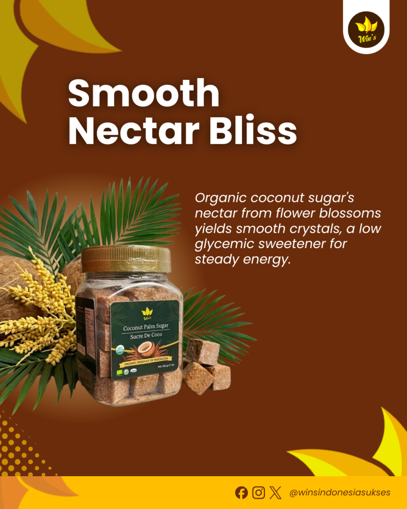 Organic coconut sugar’s nectar from flower blossoms yields smooth crystals, a low glycemic sweetener for steady energy.