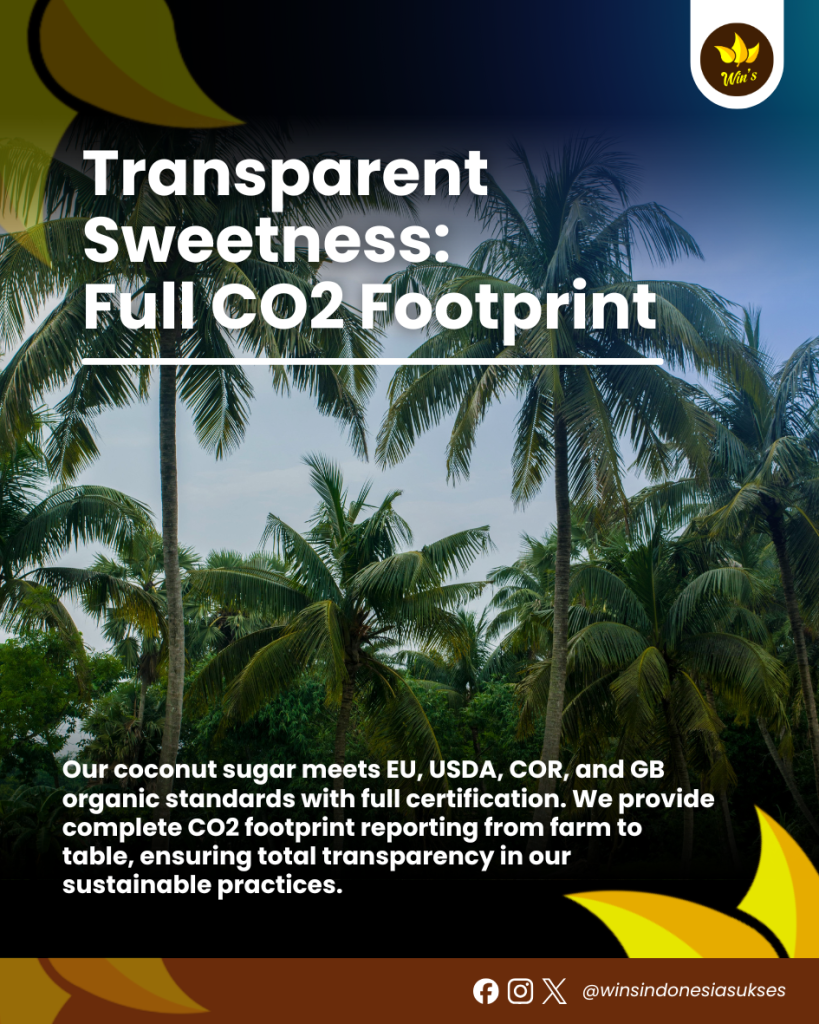 Our coconut sugar meets EU, USDA, COR, and GB organic standards with full certification. We provide complete CO2 footprint reporting from farm to table, ensuring total transparency in our sustainable practices.