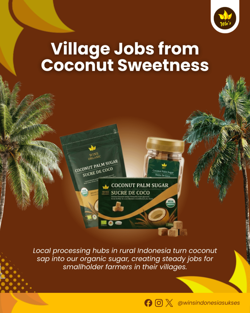 Local processing hubs in rural Indonesia turn coconut sap into our organic sugar, creating steady jobs for smallholder farmers in their villages. This keeps families home, preserving traditions while building skills.